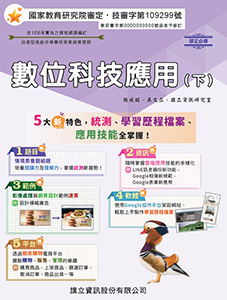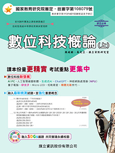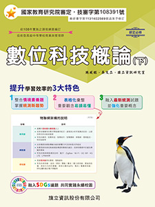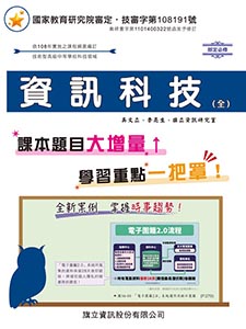 暢銷書籍 書號:C243C2 書名:資訊科技(全) 適用群科:普通高中 作者:施威銘、傅玨華、旗立資訊研究室 審定字號:普審字第108102號 書號:C213C2 書名:資訊科技(全) 適用群科:技術高中 作者:吳文立、李亮生、旗立資訊研究室 審定字號:技審字第108191號 書號:C221A3 書名:數位科技概論(上) 適用群科:商管群、外語群 作者:施威銘、吳文立、旗立資訊研究室 審定字號:技審字第108079號 書號:C222B3 書名:數位科技概論(下) 適用群科:商管群、外語群 作者:施威銘、吳文立、旗立資訊研究室 審定字號:技審字第108391號 書號:C241A3 書名:數位科技應用(上) 適用群科:商管群、外語群 作者:施威銘、吳文立、旗立資訊研究室 審定字號:技審字第109070號 書號:C242B3 書名:數位科技應用(下) 適用群科:商管群、外語群 作者:施威銘、吳文立、旗立資訊研究室 審定字號:技審字第109299號 書號:B643A3 書名:商業概論(上) 適用群科:商管群、外語群 作者:旗立財經研究室 審定字號:技審字第108063號 書號:B645A2 書名:經濟學(上) 適用群科:商管群 作者:高翠玲、陳英純、陳慧玲、蔡惠菁、蔡惠琦、旗立財經研究室 審定字號:技審字第109031號 書號:B644B3 書名:商業概論(下) 適用群科:商管群、外語群 作者:旗立財經研究室 審定字號:技審字第108300號 書號:B646B2 書名:經濟學(下) 適用群科:商管群 作者:高翠玲、陳英純、陳慧玲、蔡惠菁、蔡惠琦、旗立財經研究室 審定字號:技審字第109276號 書號:K772B3 書名:觀光餐旅業導論(下) 適用群科:餐旅群 作者:李宜玲、董歆茹、旗立餐旅研究室 審定字號:技審字第108308號 書號:K752B3 書名:餐飲服務技術(下) 適用群科:餐旅群 作者:謝美美、林玟珠、顏鳳珍、旗立餐旅研究室 審定字號:技審字第108324號 書號:K771A3 書名:觀光餐旅業導論(上) 適用群科:餐旅群 作者:李宜玲、董欣茹、旗立餐旅研究室 審定字號:技審字第108069號 書號:K751A3 書名:餐飲服務技術(上) 適用群科:餐旅群 作者:謝美美、龐麗琴、陳月卿、旗立餐旅研究室 審定字號:技審字第108070號 書號:E179A2 書名:基本電學(上) 適用群科:電機與電子群 作者:李文源、盧正川、旗立理工研究室 審定字號:技審字第108088號 書號:E175A2 書名:電子學(上) 適用群科:電機與電子群 作者:宋由禮、陳柏宏、旗立理工研究室 審定字號:技審字第109095號 書號:E180B2 書名:基本電學(下) 適用群科:電機與電子群 作者:李文源、盧正川、旗立理工研究室 審定字號:技審字第108304號 書號:E176B2 書名:電子學(下) 適用群科:電機與電子群 作者:宋由禮、陳柏宏、旗立理工研究室 審定字號:技審字第109325號